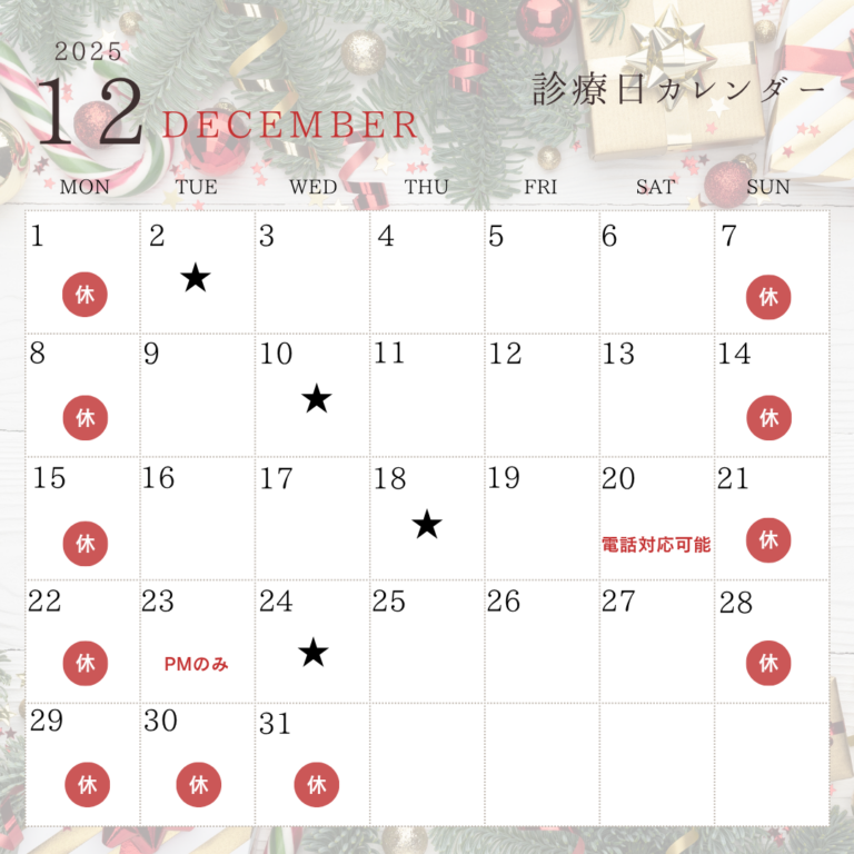 12月31日(火)~1月3日(金)は年末年始のため休診となります。