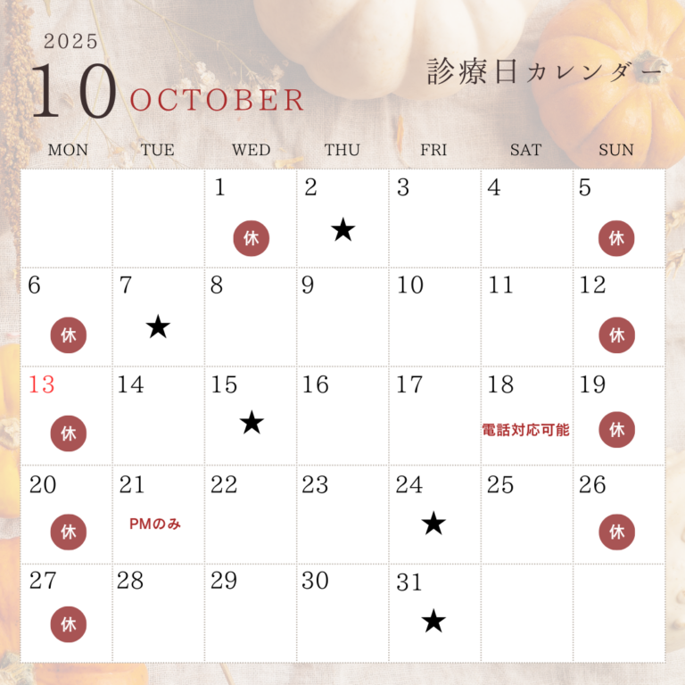 10/21(土)、11/18(土)は休診日に変更させていただきます。ご迷惑をおかけしますが、何卒よろしくお願いいたします。
