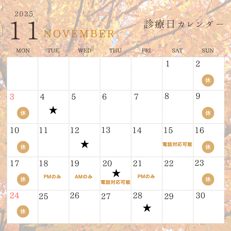 11/18(土)は休診日に変更させていただきます。12/29(金)~1/4(木)は年末年始のため休診となります。